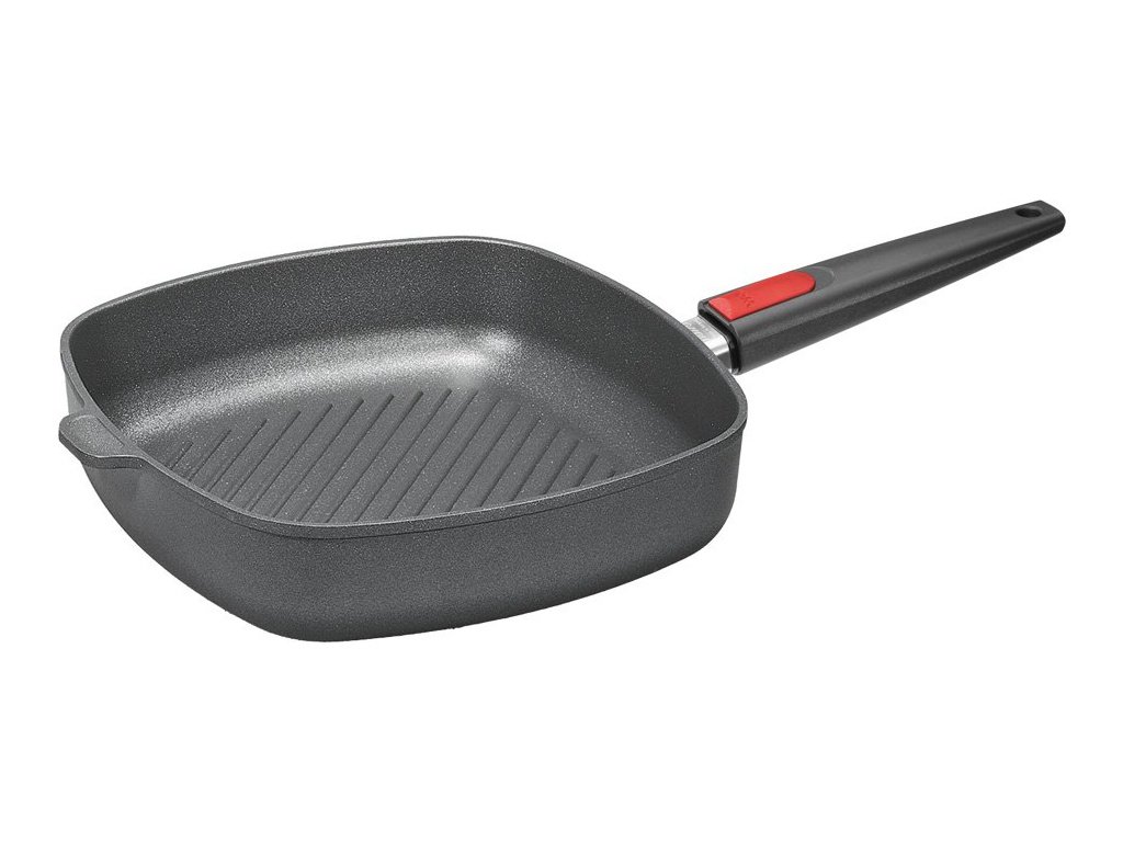Grilovací pánev 28 x 28 cm Nowo Titanium, Woll s nepřilnavým povrchem odolá tváří v tvář intenzivnímu dennodennímu vaření. Vyrobeno bez použití PFOA; inovativní indukční technologie pro nepřekonatelný výkon; skvělá tepelná vodivost; tepelně odizolovaná odnímatelná rukojeť; vhodné do trouby.