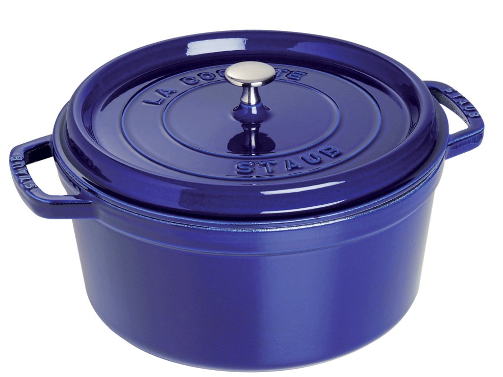 Litinový hrnec "Cocotte" Staub v modré barvě perfektně drží teplo a prakticky nezničitelný. Poklice s hroty pro pomalé vaření. Průměr 28 cm, objem 6,7 l. Vhodné na veškeré typy sporáků, včetně indukce i pro použití v troubě. Odolné do 450°C. Vyrobeno z litiny.